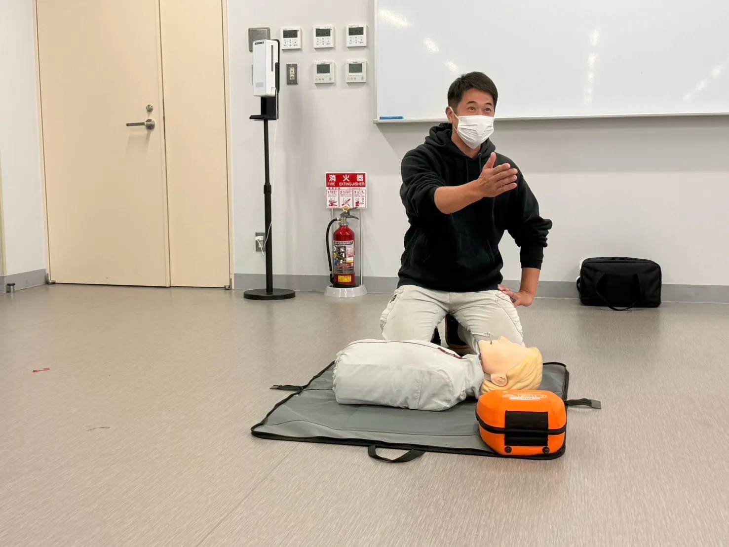 胸骨圧迫は思いのほか大変で、30回行っただけで汗ばむほどでした!
